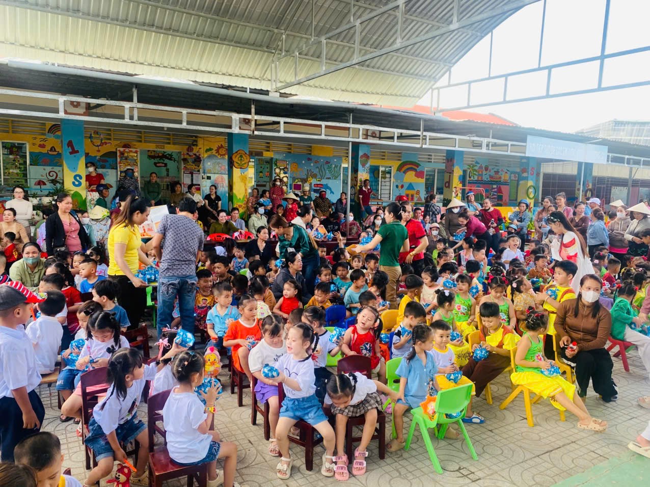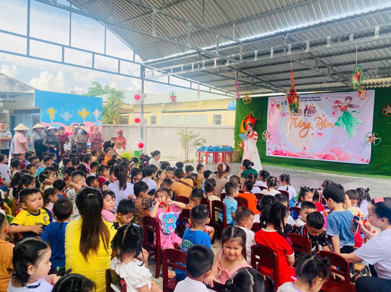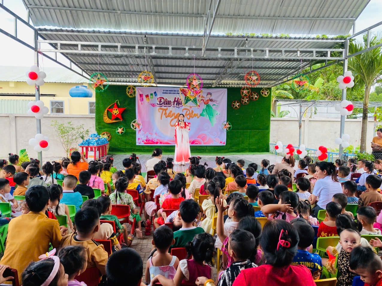 Sân trường đã trở nên nhộn nhịp với sắc màu rực rỡ của những chiếc đèn lồng, ngôi sao, bóng bay và những nụ cười hồn nhiên của các bé. Các cô giáo, phụ huynh và các em nhỏ đều háo hức chờ đón chương trình đặc biệt này.