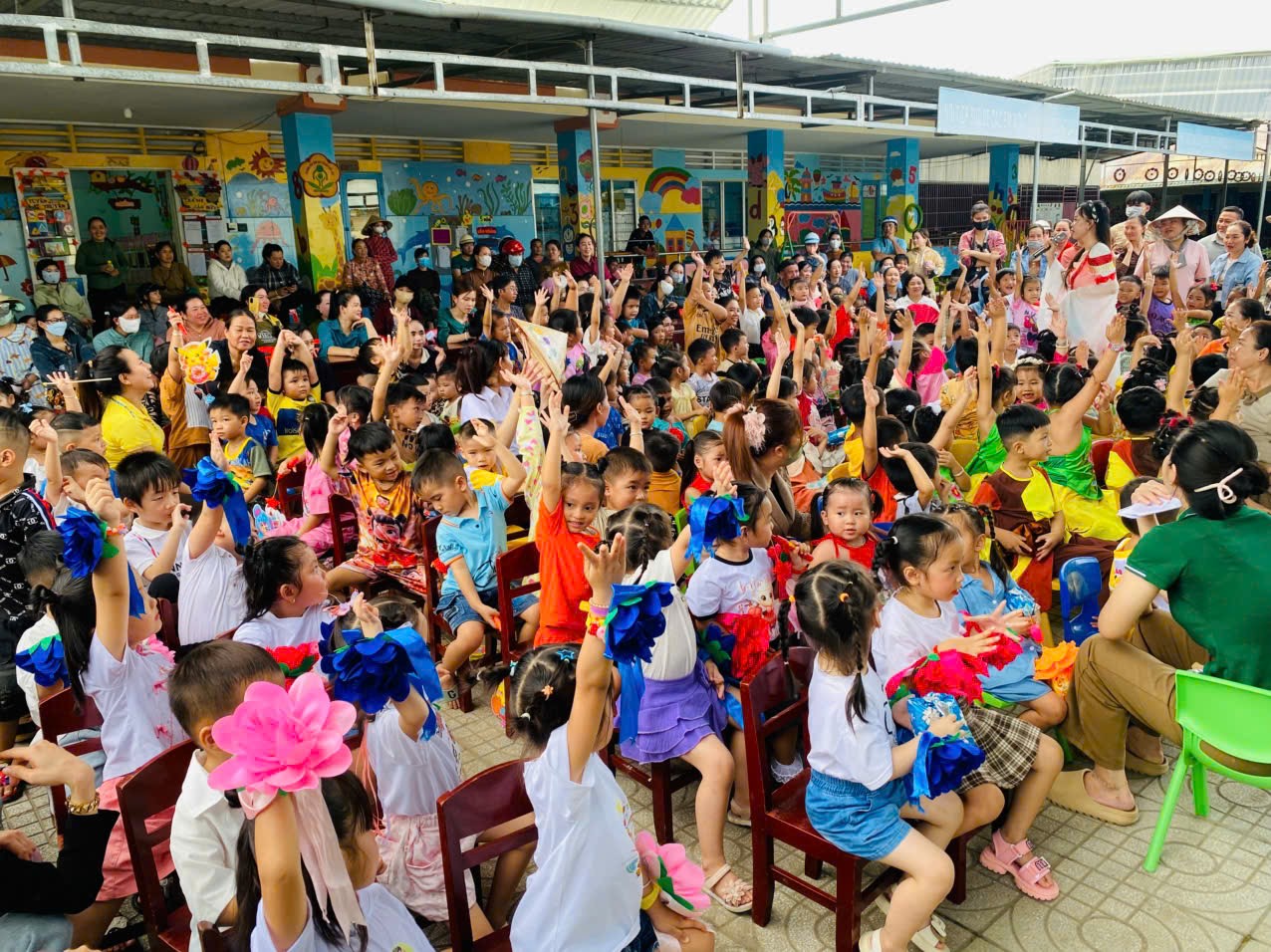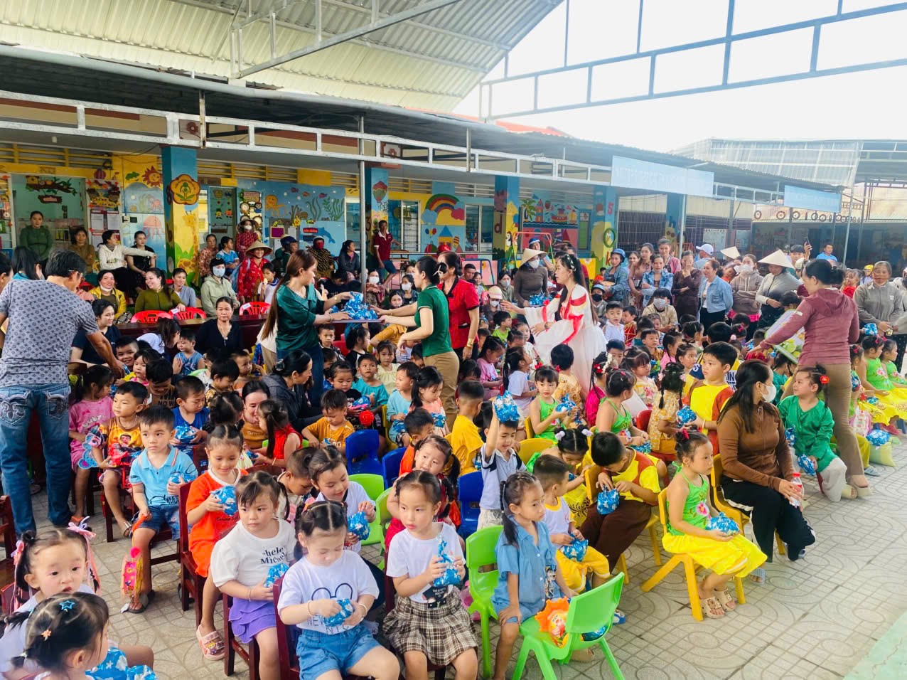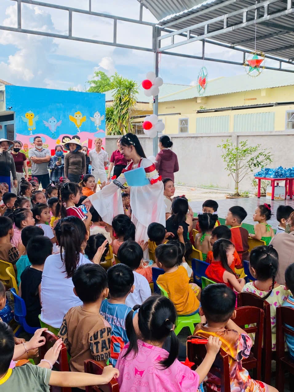 Sân trường đã trở nên nhộn nhịp với sắc màu rực rỡ của những chiếc đèn lồng, ngôi sao, bóng bay và những nụ cười hồn nhiên của các bé. Các cô giáo, phụ huynh và các em nhỏ đều háo hức chờ đón chương trình đặc biệt này.
